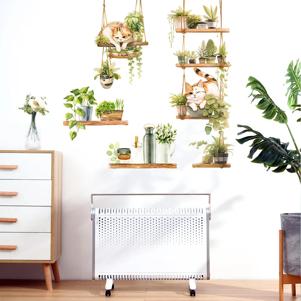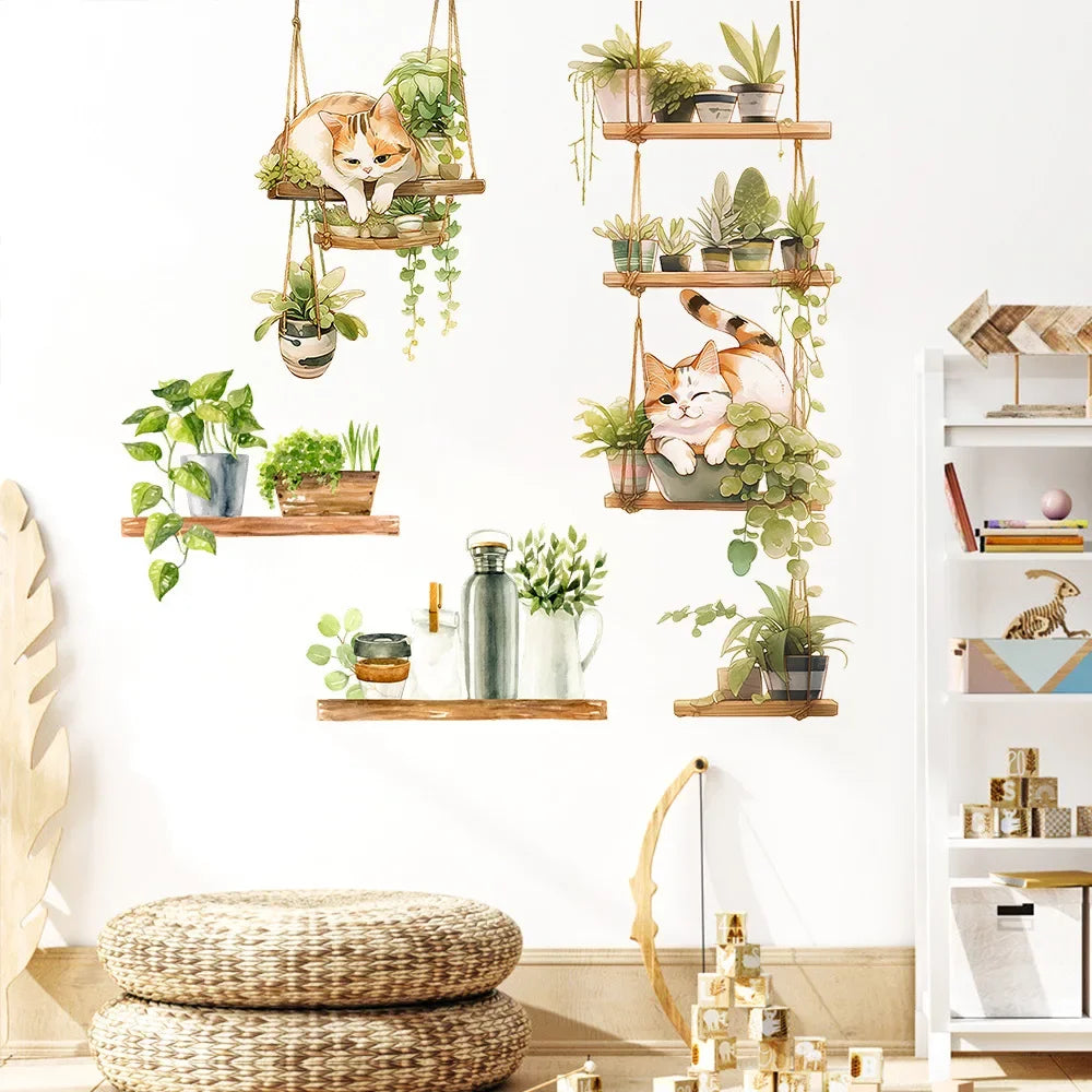 1pcs Painted Cat Green Plant Pot Home Background Wall Decoration Wall Stickers Self-Adhesive