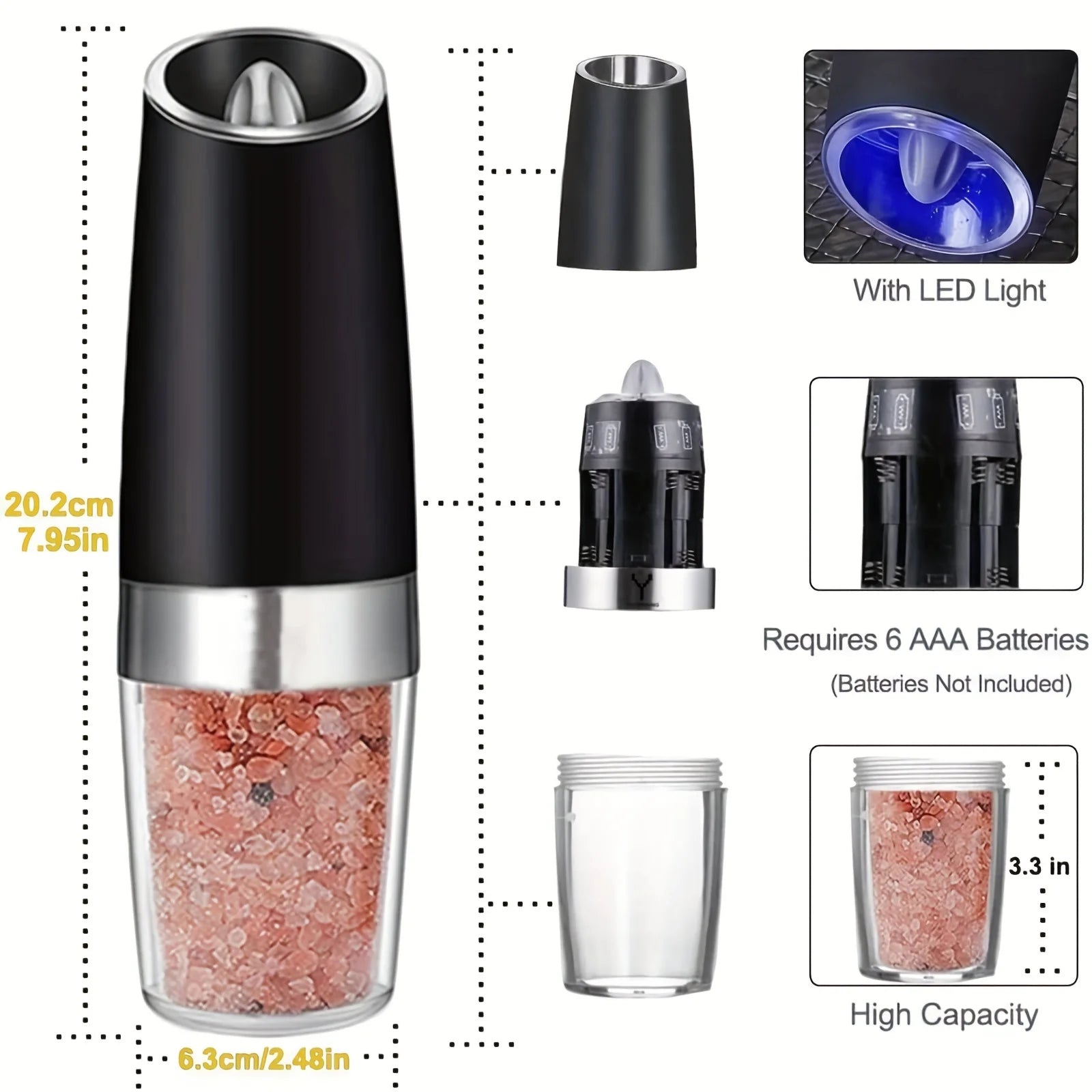 2-piece Automatic Seasoning Grinder, Adjustable Thickness,Battery powered, used for grinding spices such as pepper and sea salt