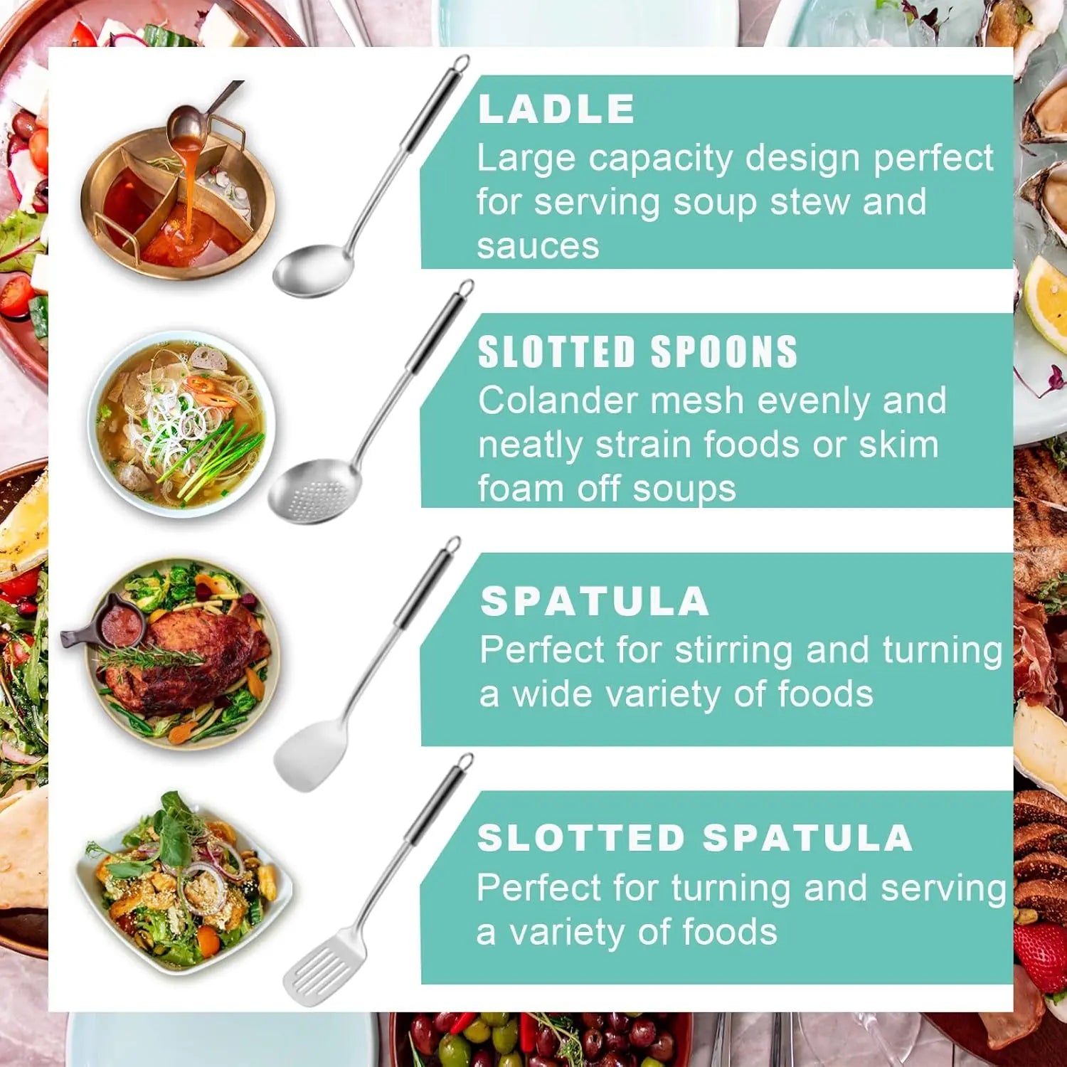 4-Pcs Cooking Utensils Set, Stainless Steel Kitchen Utensils, Wok Utensils Set Include Wok Ladle, Slotted Spoon, Wok Spatula an