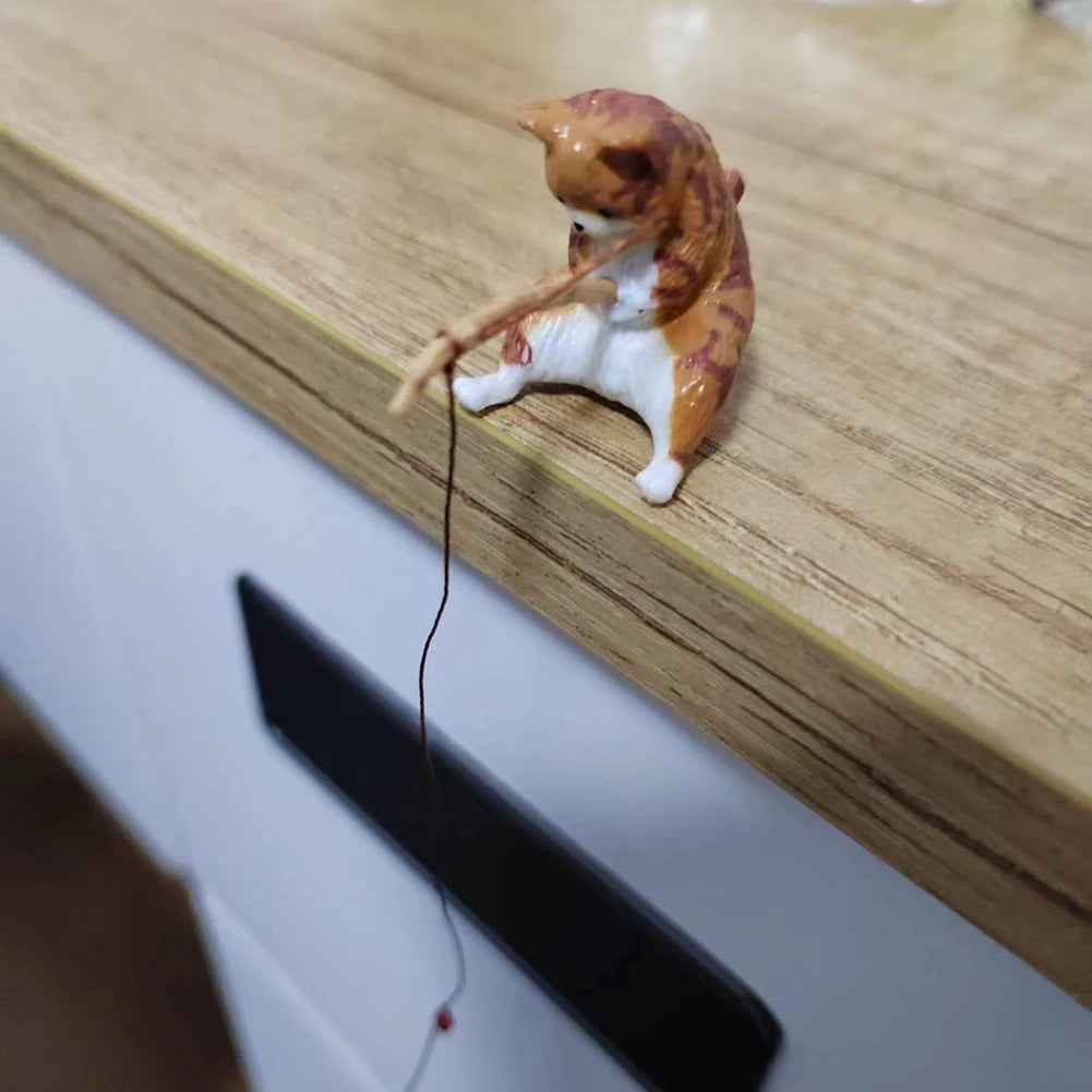 7PCS Cute Fishing Cats Ornament Mini Cat Sitting Figurines Cartoon Fish Landscaping Fish Tank Miniatures Home Decoration Crafts