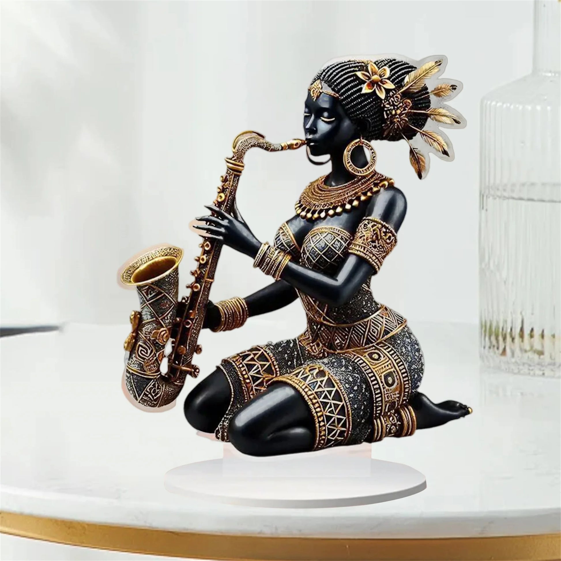 African Lady Figurine Sculpture with Saxophone Musical Instrument Handcrafted Tribal Art Statue for Home Office Decor and