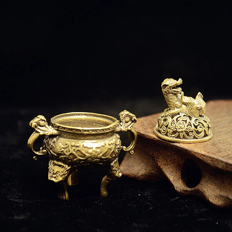 Antique Brass Three Legs Qilin Head Lotus Chinese Ancient Beast Censer Solid Copper Tea Desk Decor Censer Burner Mini Ornaments