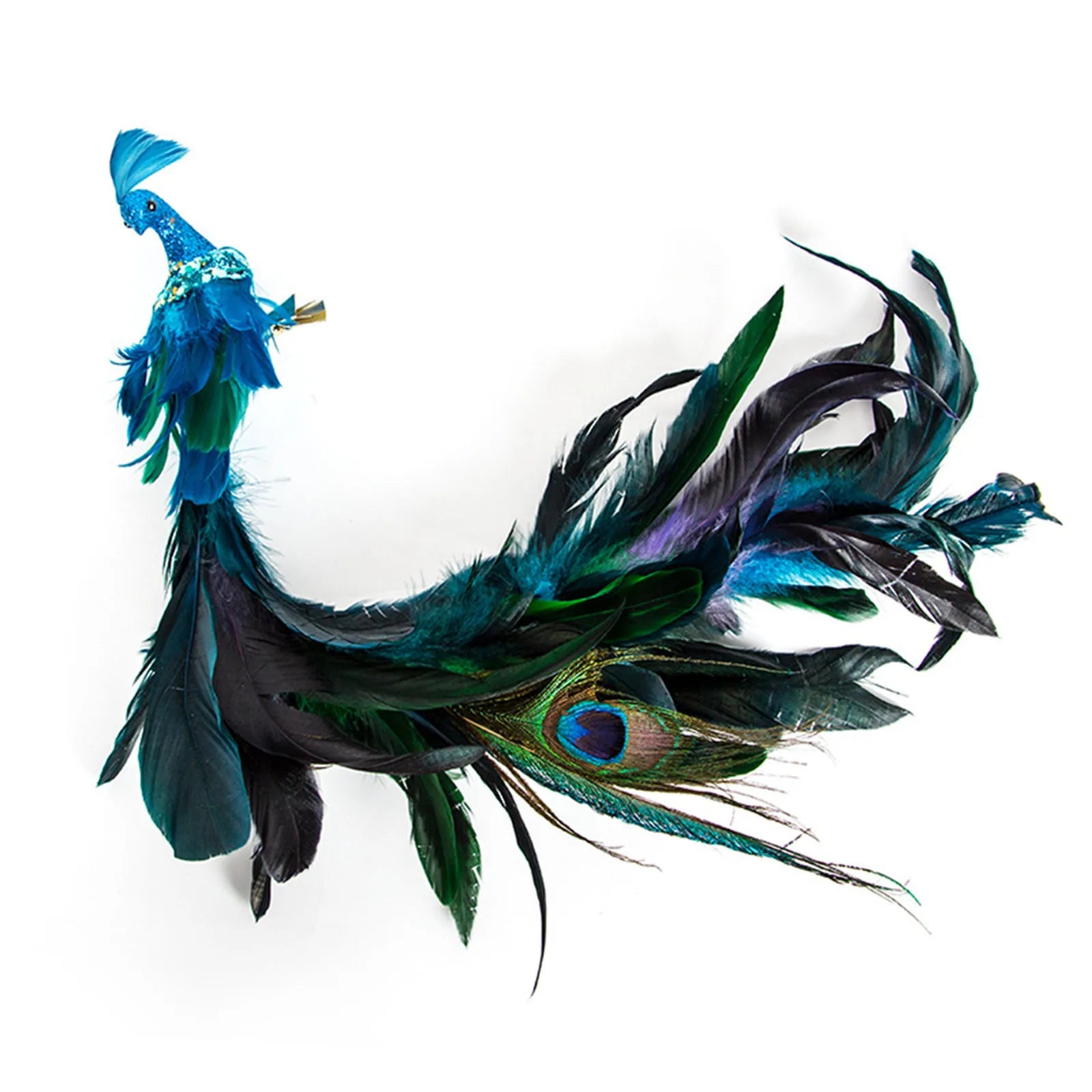 Christmas Decorations Faux Peacock Ornaments Glitter Blue Peacock Ornaments With Tail Feather Clip-On Decor Set For Christmas
