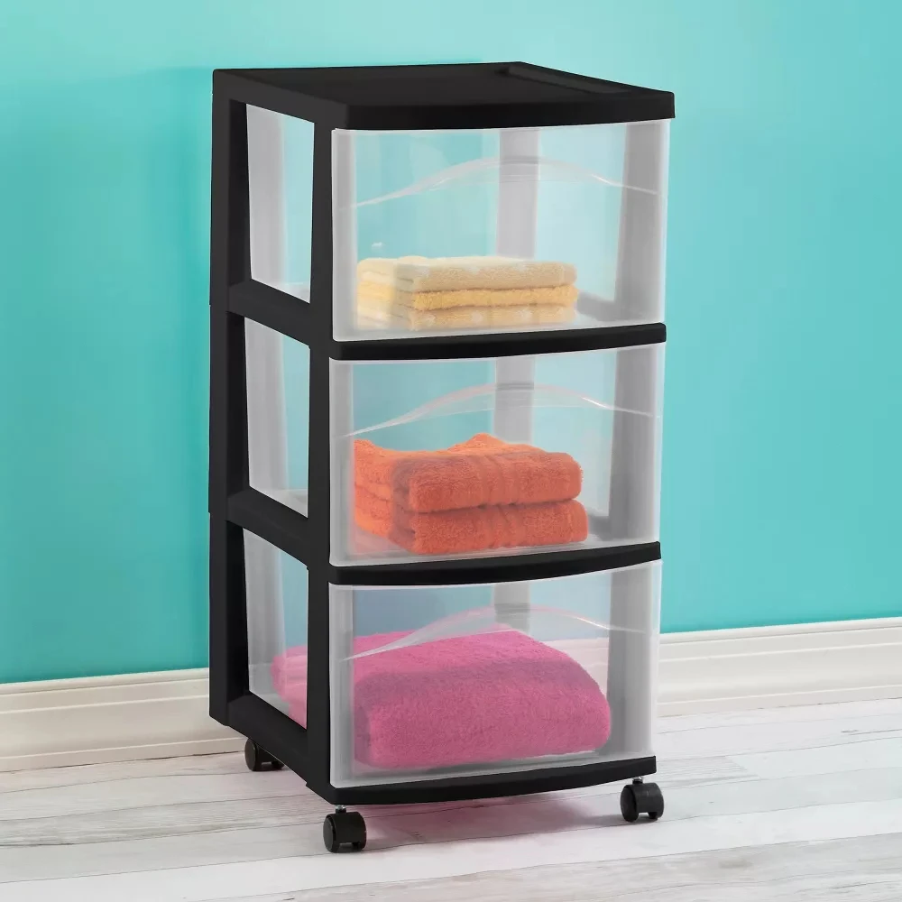 The Medium 3 Drawer Cart offers a practical and versatile storage solution for any room of the home! Organize a variety of lightweight household items where they are most frequently used - in the bedroom, kitchen / pantry, bathroom, craft room, nursery or dorm room. It can even double as a nightstand, dresser or way to make efficient use of closet space. Neatly store anything from clothing, accessories, and towels to craft supplies, health and beauty items, toys, and more. The drawer design features a modern aesthetic and sleek profile, and is clear on all sides, allowing contents to be easily identified, while keeping them contained. The drawer stop feature prevents drawers from being removed accidentally. When storing items away, be mindful of the weight in each drawer and don't overload. Add the casters to create a rolling storage option, and easily move the Drawer Cart wherever it is needed.