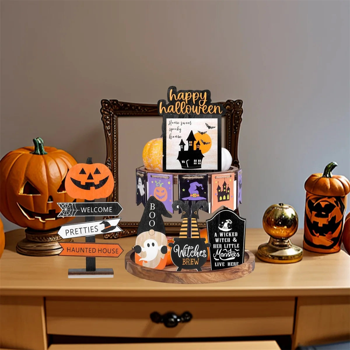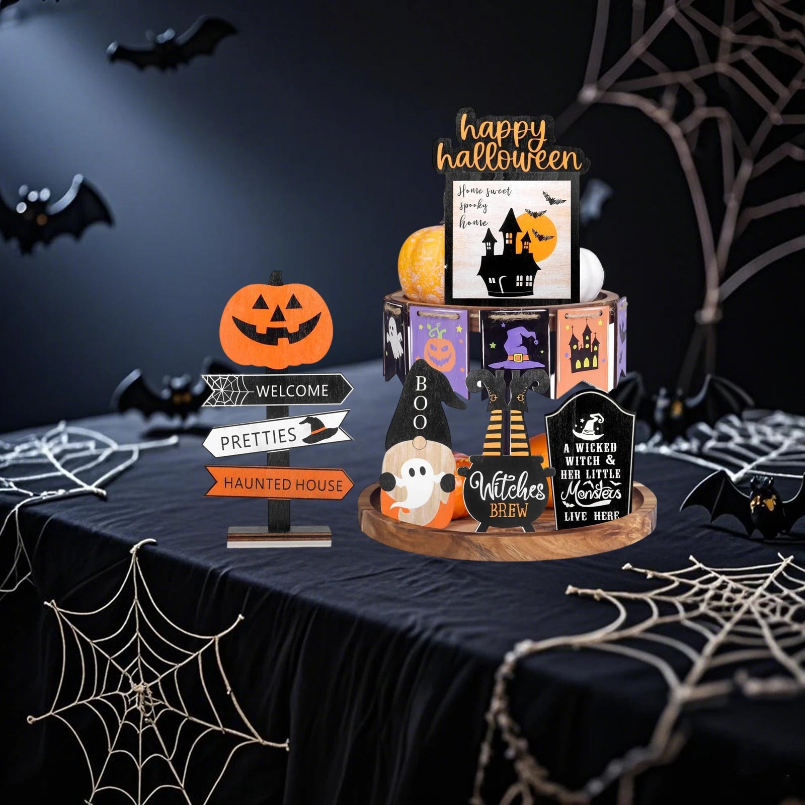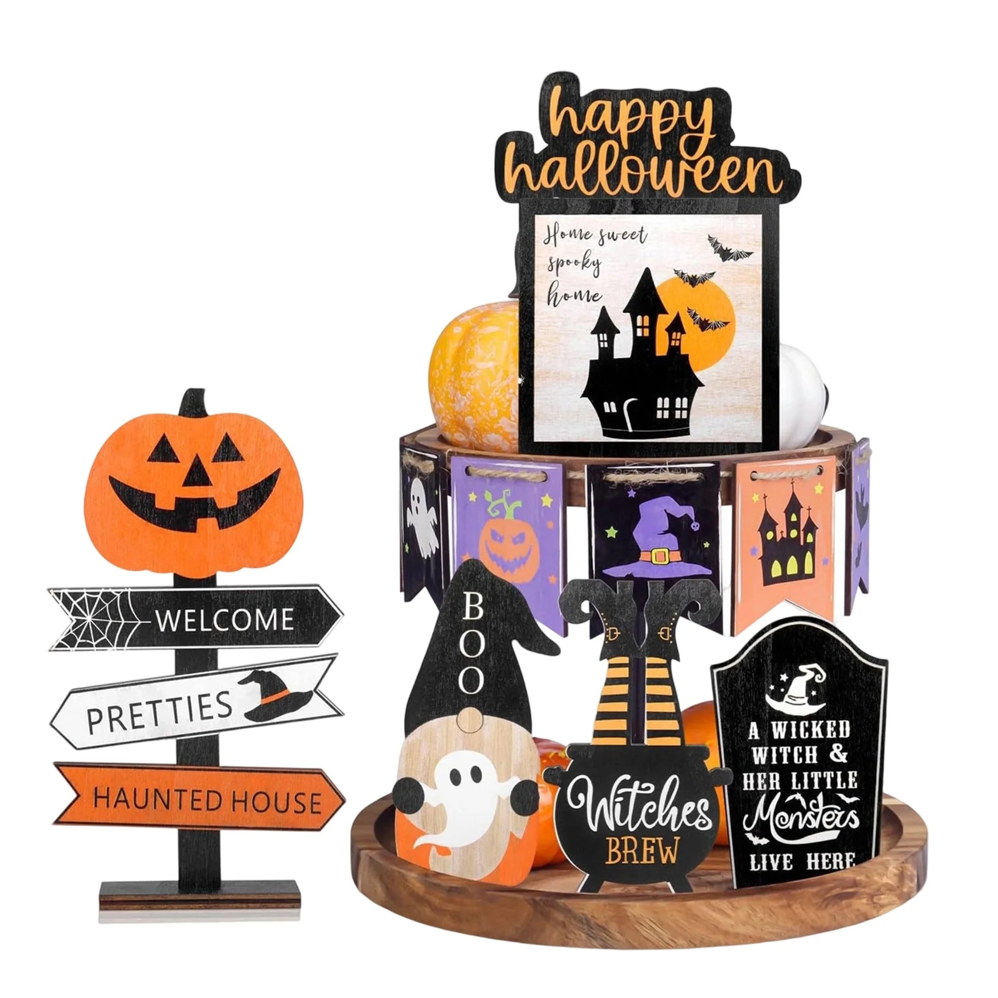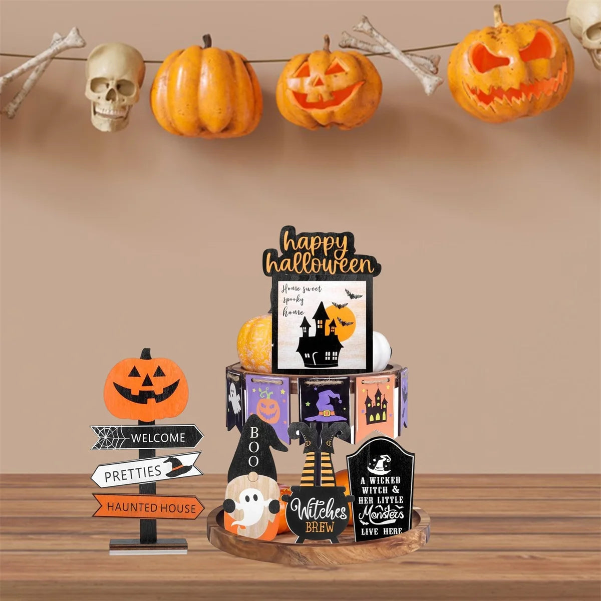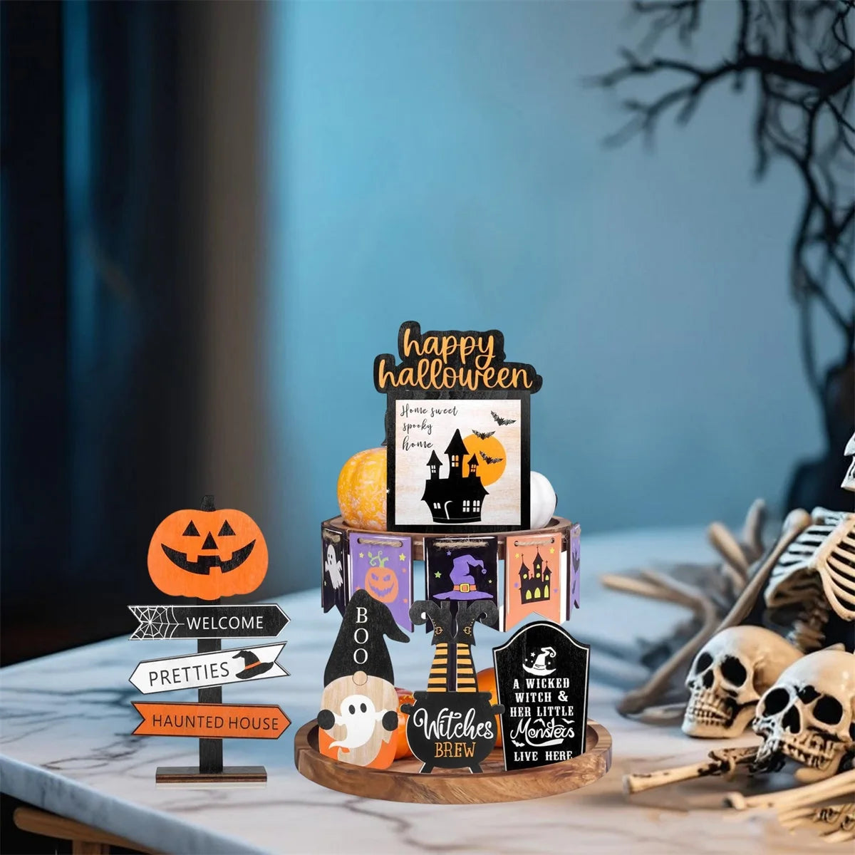 Spooky Halloween Tiered Tray Decor Set with Wooden Pumpkin and Bat Table Signs for Festive Home Party Table Display